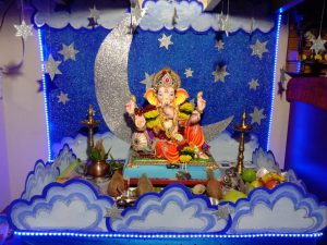 0Bappa {Ganesha} is decorated with the sky theme i.e. with the sparkling stars, clouds and beautiful moon.